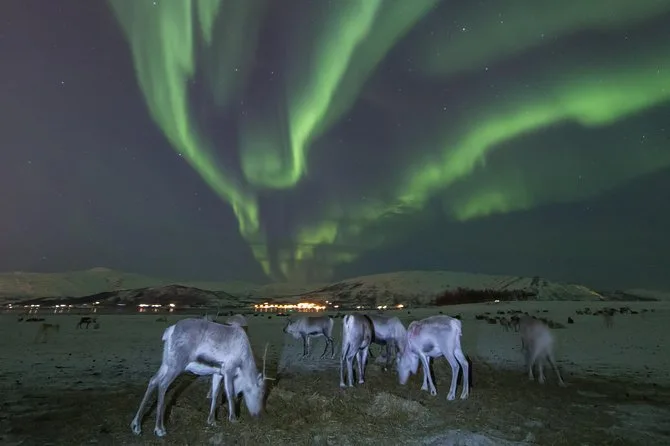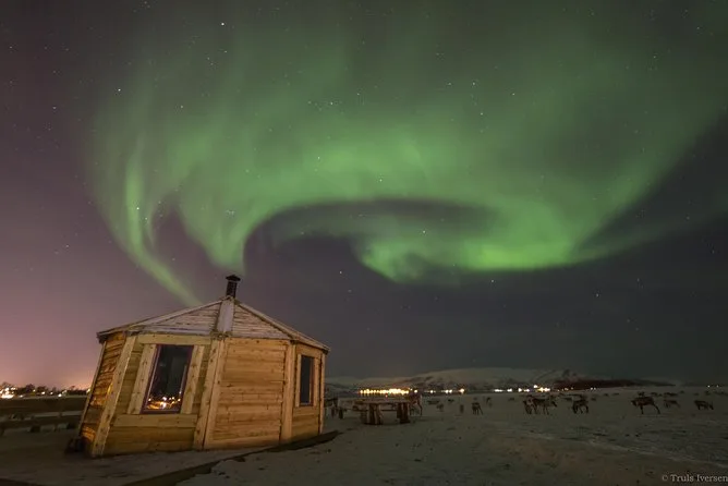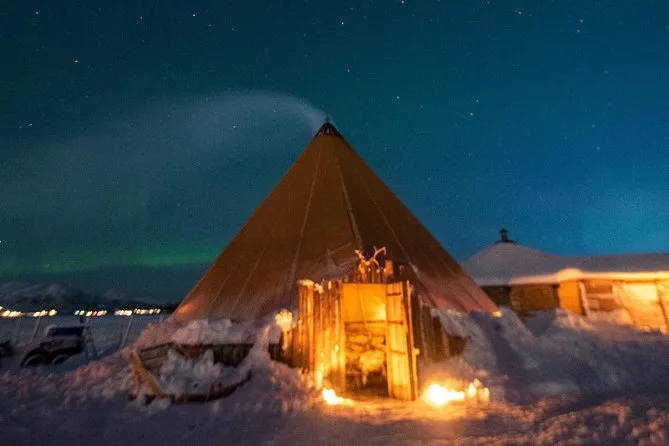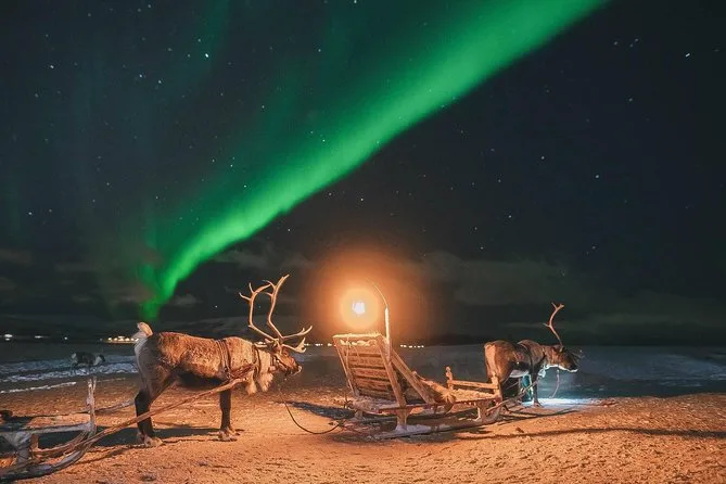 Dein Abend beginnt mit Abholung an zentralen Treffpunkten in Tromsø, Fahrt zum Camp, Zeit zum Füttern von rund 300 Rentieren (ja, sie fressen wirklich aus der Hand), eine 15–20-minütige Schlittenfahrt durch verschneite Wälder, Snacks sowie Kaffee oder Tee zum Aufwärmen in der kerzenbeleuchteten Gamme-Hütte, ein entspanntes dreigängiges Abendessen mit Bidos-Eintopf vom offenen Feuer, gefolgt von Geschichten und Joik-Gesang am Lagerfeuer, bevor es zurück in die Stadt geht.