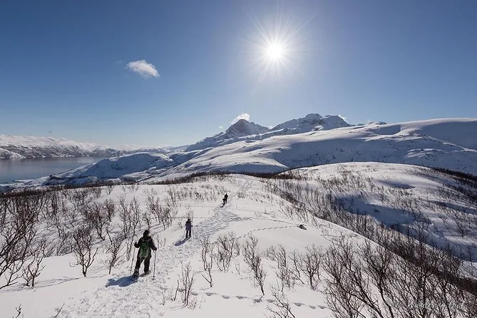 Dein Tag startet mit Abholung am Scandic Ishavhotel im Zentrum von Tromsø, inklusive kompletter Ausrüstung wie Schneeschuhe und Wanderstöcke (oder nur Stiefel, falls kein Schnee liegt), einem Lunchpaket mit Kaffee oder Tee – auch vegetarisch oder glutenfrei auf Wunsch – sowie Souvenirfotos, die du nach der Wanderung per E-Mail bekommst, bevor es zurück in die Stadt geht.