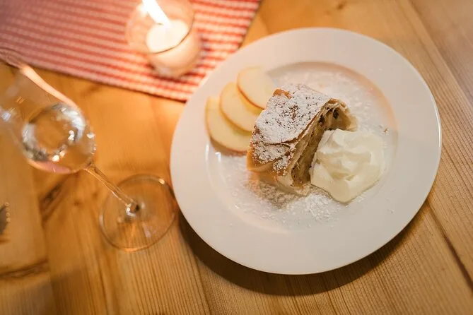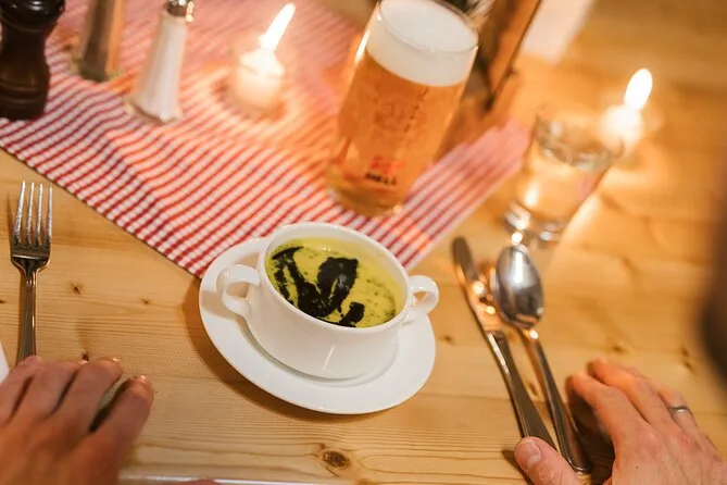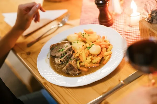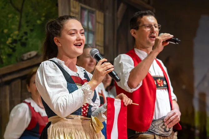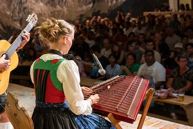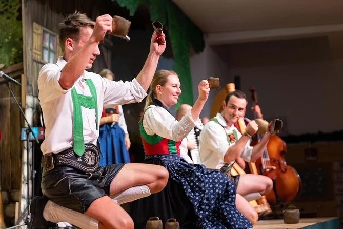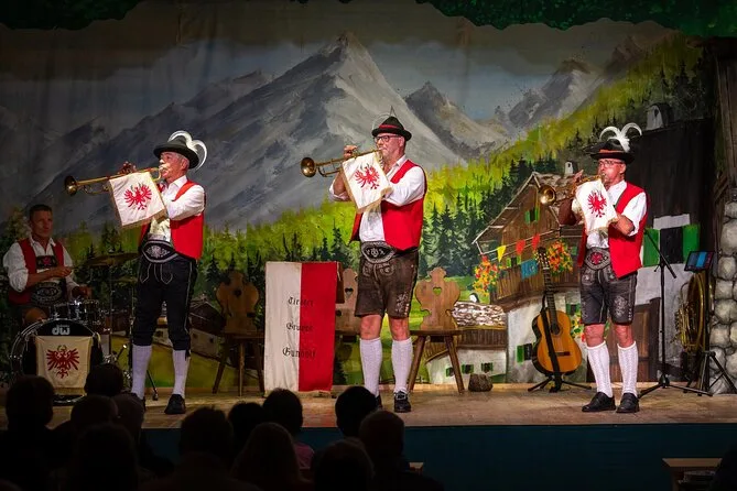 Dein Abend umfasst den Eintritt zum 90-minütigen Tiroler Volksmusikabend im ALPENSAAL mit Live-Musik und Tanz von lokalen Künstlern sowie ein Getränk; wenn du die Dinner-Option wählst, bekommst du außerdem ein 3-Gänge-Menü mit Kürbissuppe, Schweinsbraten (oder vegetarischer Alternative) und Apfelstrudel, bevor du wieder in die Innsbrucker Nacht hinausgehst.