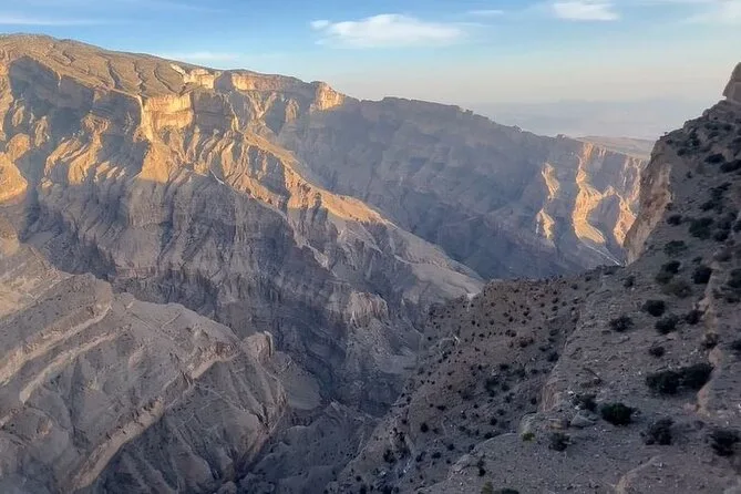 Al Hamra hat mich überrascht. Auf der einen Seite sieht man modernes Leben, auf der anderen stößt man plötzlich auf stille Ruinen – manche Mauern bröckeln, andere halten nach Jahrhunderten noch stand. Misfat Al Abriyeen war ein weiteres Highlight: enge Gassen mit Lehmhäusern, Kinder flitzen vorbei und tragen frisches Brot aus einer winzigen Bäckerei hinter einer grünen Tür. Kurz vor Sonnenuntergang erreichten wir Jebel Shams – die Luft war hier oben kühler, fast frisch, selbst im späten Frühling. Der Himmel färbte sich orange über dem Canyon-Rand, während Ziegen zwischen unseren Füßen auf dem Sama Heights Camp umherstreiften.