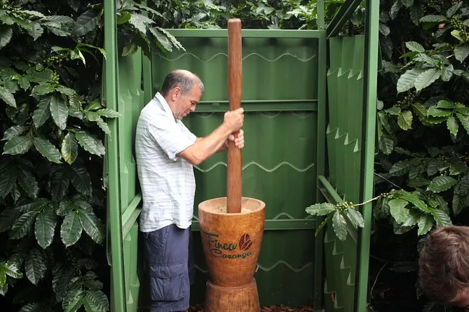 Carlos zeigte uns, wie man die Kirschen pflückt – nicht zu grün, nicht zu dunkel – und nach ein paar Minuten waren meine Hände rot gefärbt. Er lachte, als ich versuchte, „pilon“ auszusprechen (richtig krieg ich’s bis heute nicht hin), und ließ mich dann selbst die Bohnen stampfen. Dieser Stock ist schwerer, als er aussieht! Es ist etwas Besonderes, die Bohnen unter den Händen zu spüren – man achtet viel mehr darauf; es ist schmutziger, als man denkt, und mein Shirt roch noch Stunden später leicht süßlich.