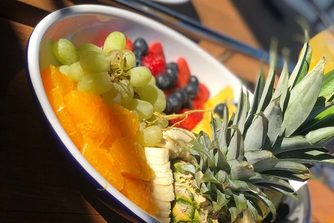 Dein Tag umfasst alle Treibstoffkosten, die Nutzung von Schnorchel- und Stand-up-Paddle-Boards an beiden Strandstopps sowie morgens salzige Snacks und nachmittags eine frische Obstplatte mit kalten Getränken, während du an Deck zwischen den Schwimmphasen entspannst.