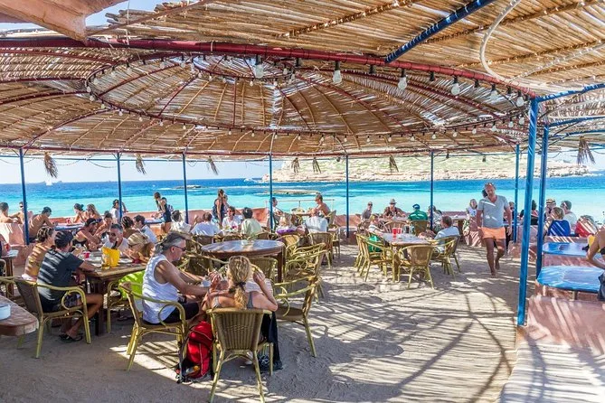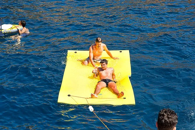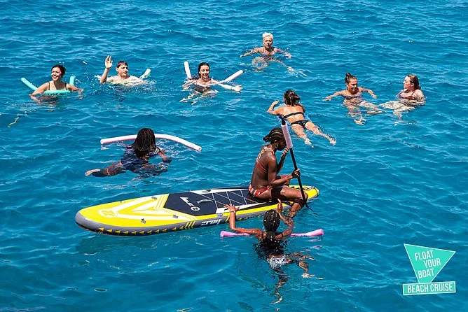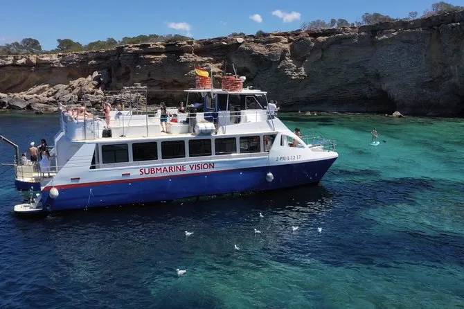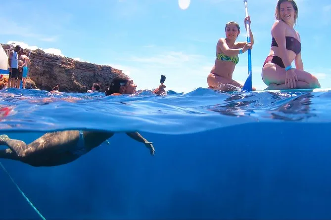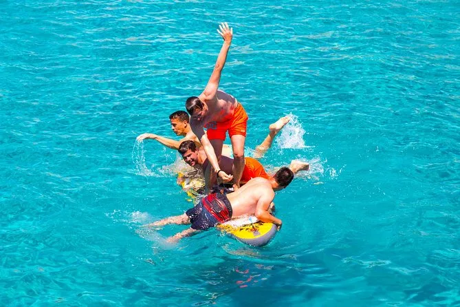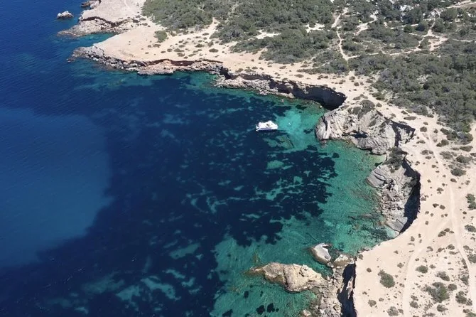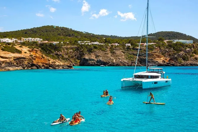 Dein Tag umfasst sechs Stunden Katamaranfahrt entlang Ibizas Küste mit Glasbodenblick; Stopps an Cala Bassa und Cala Compte; unbegrenzte Nutzung von Paddleboards, Bodyboards und schwimmenden Matten; kostenlose Schnorchelausrüstung; Buffet-Mittagessen mit frischem Obst und lokalen Snacks; Bier, Sangria, Wein oder Softdrinks; dazu Rettungsschwimmer auf Kajaks für extra Sicherheit – entspannt geht’s am Abend zurück.