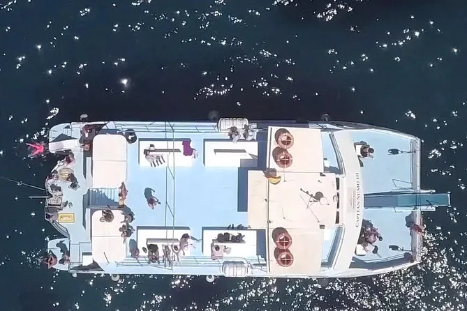 Dein Tag umfasst eine geführte Bootstour ab San Antonio mit Stopps an den Stränden Cala Bassa und Cala Comte, die Nutzung von Paddle-Boards und Schnorchelausrüstung an jedem Badehalt, vier alkoholische Getränke pro Person sowie unbegrenzt Softdrinks und Wasser. Frisches Obst, Pizzastücke, Brot, Tortilla und Salate werden an Bord serviert, bevor es nach dem Sonnenuntergang am Café Mambo zurückgeht.