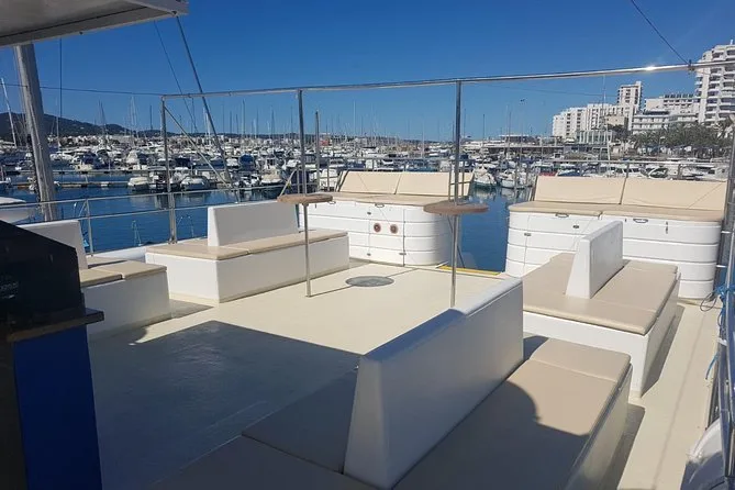 Kaum hatten wir den Hafen von San Antonio verlassen, da grinste unser Guide Miguel und reichte mir ein Glas Cava – „Das brauchst du für die Rutsche“, sagte er. Ich musste lachen, war aber ehrlicherweise nervöser, das „gracias“ richtig auszusprechen, als mich von der Bootsrutsche ins Meer zu stürzen. Leise Musik lag in der Luft, Leute unterhielten sich auf Spanisch und Englisch, und dieser salzige Duft, den man nur am Mittelmeer kennt. Das Boot war nicht voll – vielleicht halb besetzt – sodass jeder genug Platz hatte, um sich entspannt hinzulegen oder herumzulaufen, ohne anzuecken.