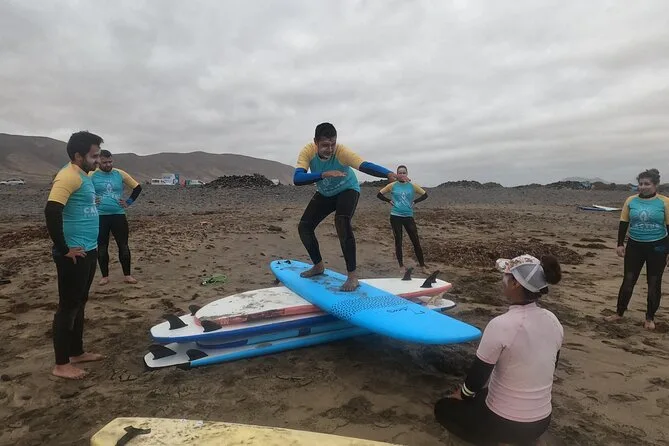 Los ging’s mit ein paar einfachen Dehnübungen am Strand, nichts Aufwendiges – nur um den Körper locker zu machen. Pablo teilte uns in kleine Gruppen auf (nie mehr als vier pro Lehrer), so fühlte sich alles ganz persönlich an. Er erklärte die Basics: wie man paddelt, aufsteht und was zu tun ist, wenn man mal ins Wasser fällt (was mir mehrmals passiert ist). Die Neoprenanzüge waren überraschend bequem, und die Boards sahen gebraucht, aber top in Schuss aus. Die knalligen Lycra-Shirts der Surfschule helfen dir, deine Gruppe im Wasser schnell wiederzufinden.