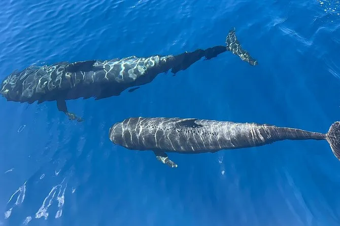 Wir fuhren weiter raus als gedacht – etwa drei Meilen vor Costa Adeje, meinte er – und warteten einfach. Es war ganz still, nur Möwen kreisten über uns und alle flüsterten, um die Tiere nicht zu verscheuchen. Dann kamen die Snacks raus (Obst, kleine Sandwiches), und ehrlich gesagt fühlte es sich fast surreal an, beim Ausschauhalten zu essen. Zwischendurch roch ich diese Mischung aus Sonnencreme und Orangen – seltsam beruhigend. Plötzlich bewegte sich die ganze Gruppe zur einen Seite: Pilotwale direkt neben uns, so leise, dass man sie fast verpasst hätte, wenn man geblinzelt hätte.