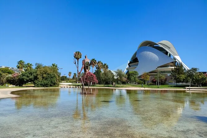 Der Weg führt an Skulpturen und Brunnen vorbei – an einem planschten gerade ein paar Enten, als wir vorbeikamen. Es geht nicht nur geradeaus, aber die Steigungen sind gut machbar. Marta zeigte uns die alten Brücken über uns, jede mit ihrer eigenen Geschichte. Nach etwa einer halben Stunde taucht die moderne Seite der Stadt auf: die Ciudad de las Artes y las Ciencias. Die Gebäude wirken wie aus einem Science-Fiction-Film – besonders das Hemisfèric, das wirklich wie ein riesiges, zwinkerndes Auge aussieht. Wir machten eine Pause draußen, während Marta erklärte, was in den einzelnen Gebäuden passiert, vom Planetarium bis zum Opernhaus. Hier herrscht eine besondere Ruhe, trotz der Menschen – vielleicht liegt es am Wasser oder daran, wie das weiße Licht von den Gebäuden reflektiert wird. Wir machten Fotos und genossen den Moment, bevor es zurückging.