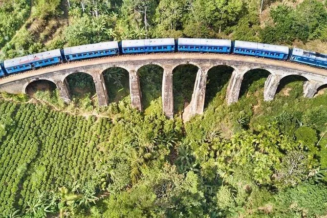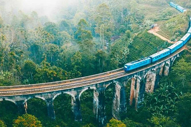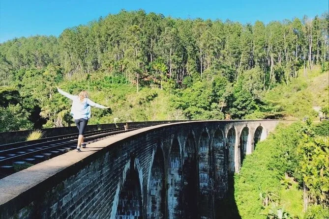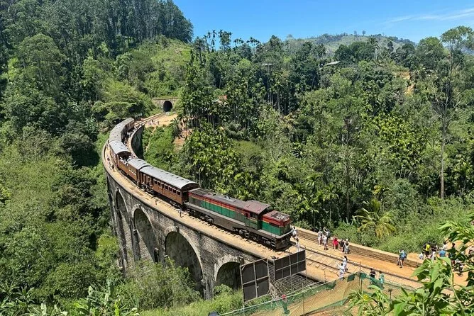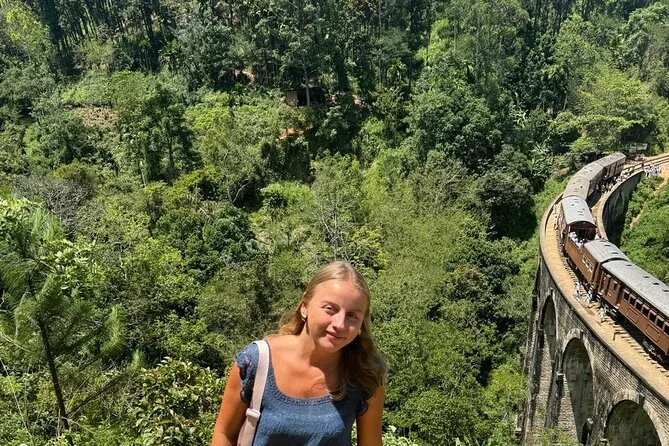 Als nächstes stand der Demodara Loop auf dem Programm – eine spiralförmige Eisenbahnstrecke, die britische Ingenieure vor langer Zeit gebaut haben. Wir beobachteten, wie ein blauer Zug die Hügel umrundete, während sein Pfeifen zwischen den Felsen widerhallte. Die berühmte Nine Arches Bridge war nicht weit; wir warteten auf den perfekten Moment, wenn der Zug darüberfuhr – alle hielten kurz den Atem an, bevor die Kameras wieder klickten. Es ist schon erstaunlich, wie eine einfache Brücke zu so einem besonderen Erlebnis werden kann.