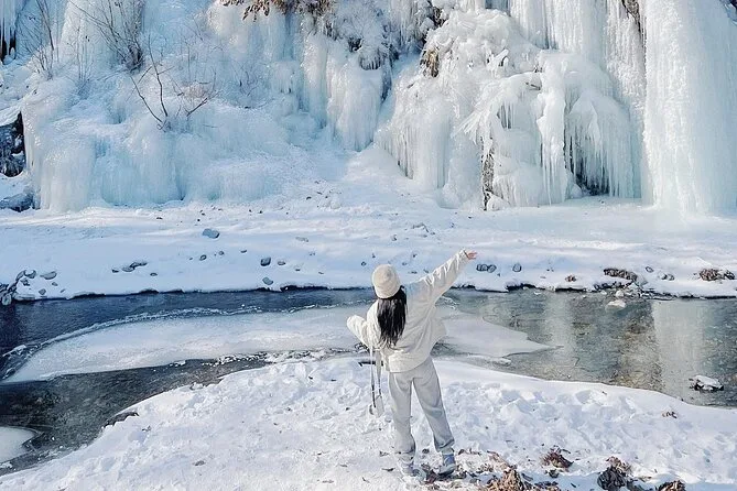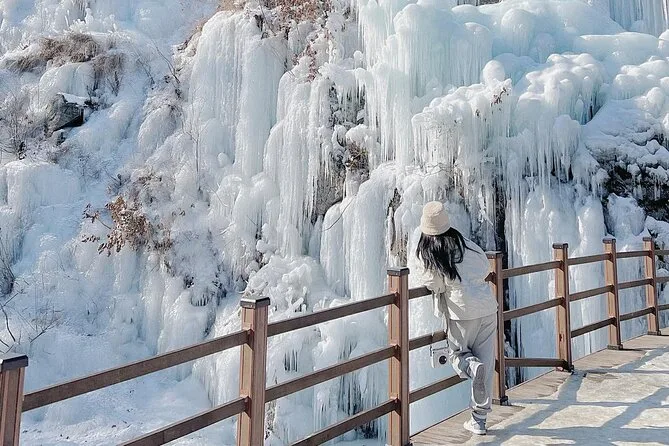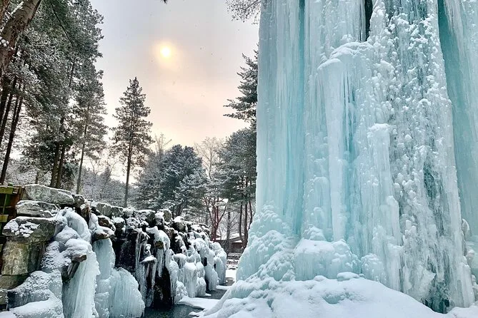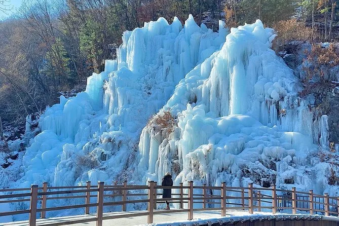 Starte früh in Seoul und tauche ein in die eisigen Wände des Eobi Ice Valley, bevor du mit der Fähre zur ruhigen Nami Island fährst, um die Baumalleen zu erkunden und Streetfood zu genießen. Pedaliere nostalgische Rail Bikes durch die Landschaft im Gangchon Rail Park und lass den Tag im stimmungsvoll beleuchteten Garden of Morning Calm ausklingen. Ein Tag voller Winterwunder, der dich still dankbar macht.