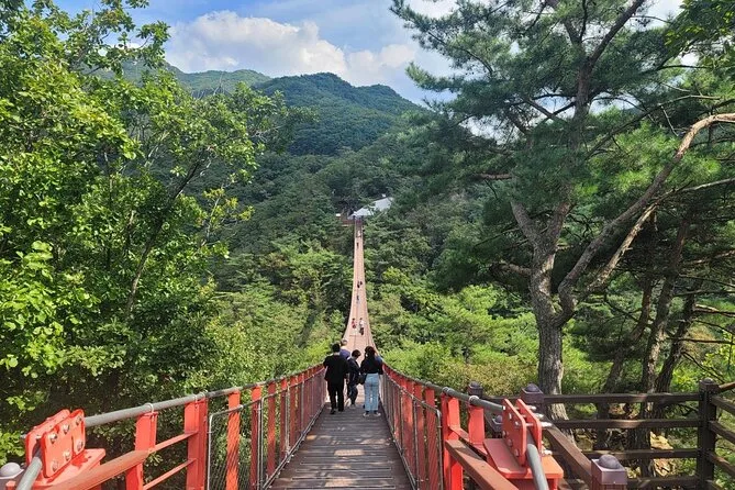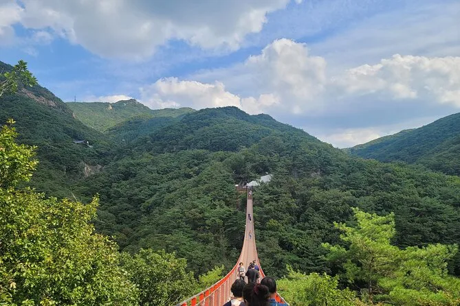 Blick vom Dora-Observatorium auf Nordkorea, Besuch des Dritten Tunnels, Imjingak Park, Snacks im Unification Village, Wanderung und Überquerung der Hängebrücke am Mt. Gamaksan.