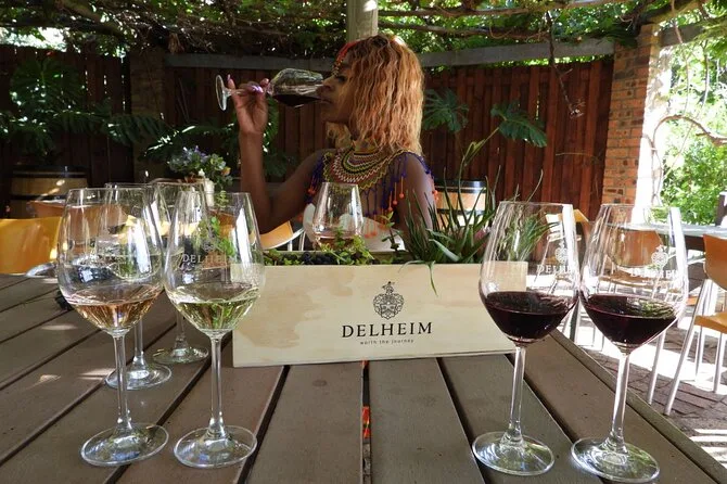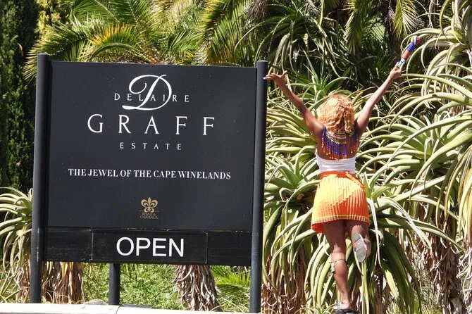 Die Tour umfasst Verkostungen auf vier Weingütern: Delaire Graff (bzw. Haute Cabrière bis Okt 2025), Tokara, Delheim und Fairview.