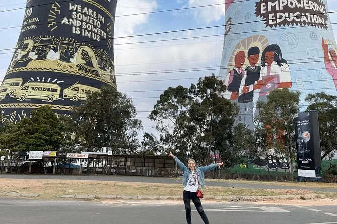 Auf der Fahrt durch Braamfontein und Newtown sahen wir bunte Wandmalereien an alten Lagerhäusern und Kinder, die zwischen den Autos zur Schule eilten. Thabo kommentierte das Geschehen – mal ernst, mal lachend über die verrückten Fahrer in Joburg. Wir fuhren am FNB Stadium vorbei (für ihn „Soccer City“), das selbst von der Straße aus riesig wirkte. Plötzlich waren wir in Soweto, wo alles irgendwie bunter wirkte – Wäsche flatterte an Leinen, Musik klang aus offenen Fenstern. Die Soweto Towers tauchten vor uns auf; heute bunt bemalt, waren sie früher Teil eines Kraftwerks. Ich wollte ein Foto machen, verpasste es aber, weil ich zu sehr damit beschäftigt war, Leute zu beobachten, die uns zuwinkten.