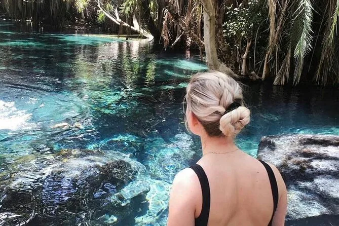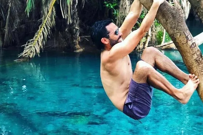 Nach dem Essen stiegen wir wieder in den Van für das, was Joseph „die afrikanische Massage“ nannte – was sich als 40 Minuten holprige Fahrt zu den Chemka Hot Springs entpuppte. Die sind nicht wirklich heiß, eher wie warmes Badewasser und unglaublich klar. Einheimische planschten herum, und jemand hatte eine Seilschaukel über dem blauen Wasser aufgehängt. Ich probierte sie einmal aus (nicht besonders elegant), dann ließ ich mich unter den Bäumen treiben, lauschte den Vögeln und der Musik, die irgendwo von einem Handy kam. Wer will, kann sich direkt am Wasser ein Barbecue grillen lassen; wir blieben bei Limo und ließen die Sonne uns trocknen.