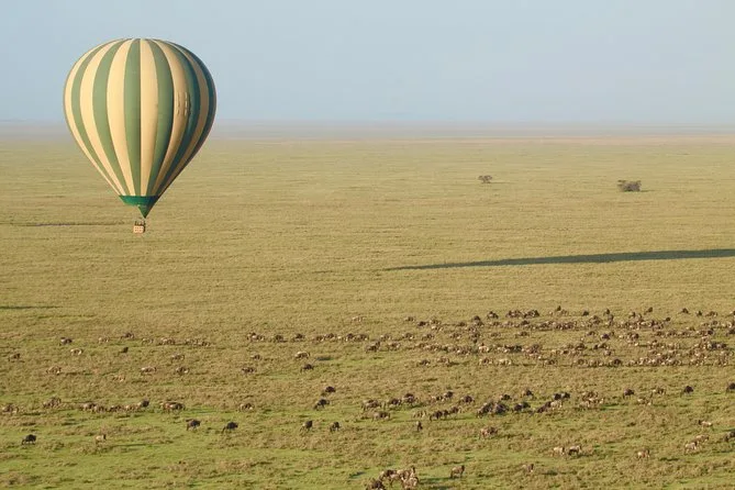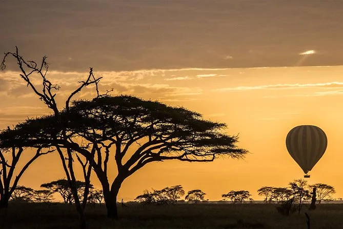 Erlebe eine Heißluftballonfahrt über die Serengeti bei Sonnenaufgang mit einem erfahrenen lokalen Piloten, beobachte Wildtiere aus der Luft und genieße nach der Landung einen Sektempfang sowie ein englisches Buschfrühstück unter einer Akazie – ein unvergessliches Erlebnis.