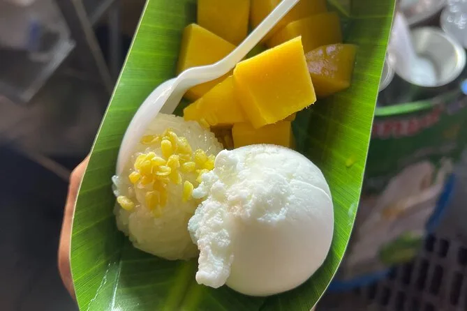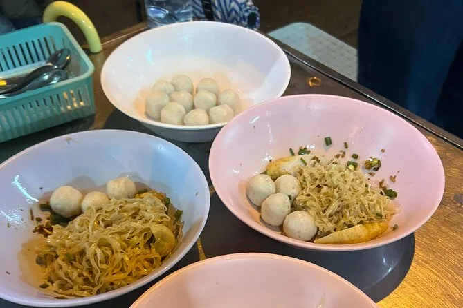 Nach dem vierten Snack – irgendwas Knuspriges – verlor ich den Überblick, doch Fon erzählte weiter von ihrer Kindheit hier und von den Lieblingsständen ihres Vaters. Am Ende landeten wir bei einem weiteren Michelin-gekrönten Nudelstand mit Fischbällchen, die pure Wohlfühlküche waren. Zum Nachtisch konnte man wählen: Mango Sticky Rice oder frittierte Donuts, die noch Stunden später Zucker an meinen Fingern hinterließen. Danach schlenderten wir eine alte Barstraße entlang; die Luft war warm und dicht, und aus einer geschlossenen Bar klang leiser Thai-Pop. Verrückt, wie voll man sich fühlen kann und trotzdem noch einen Bissen mehr will.