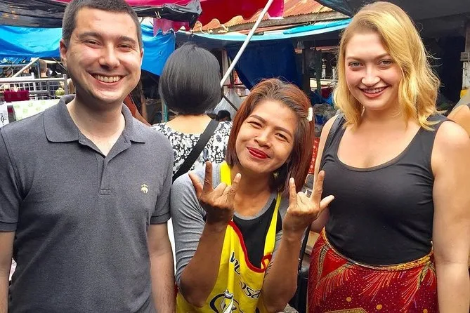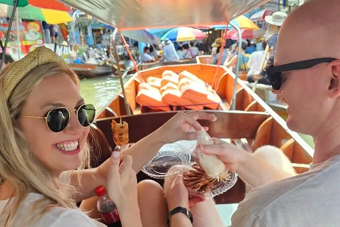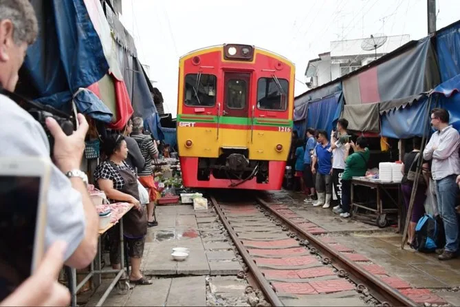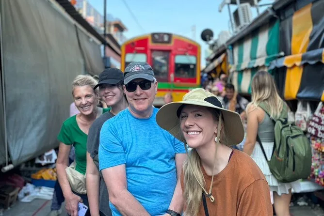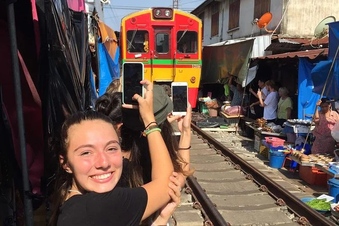 Erlebe Bangkoks aufregendste Märkte hautnah: Spüre den Zug am Maeklong Railway Market ganz nah vorbeifahren, bevor du per privatem Boot zum Damnoen Saduak Floating Market gleitest. Probiere exotische Früchte, lache mit deinem Guide über lustige Aussprachen und genieße das bunte, lebendige Treiben unter den gestreiften Schirmen.