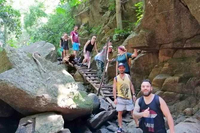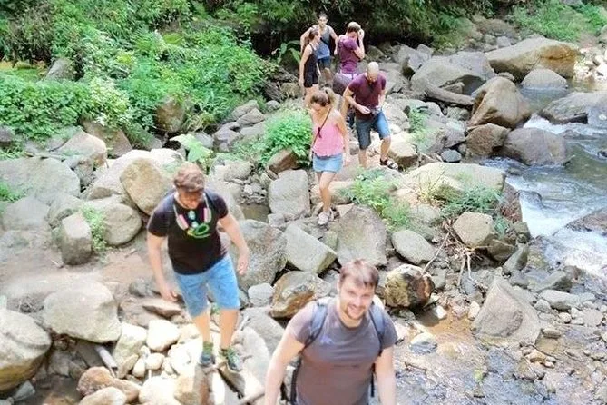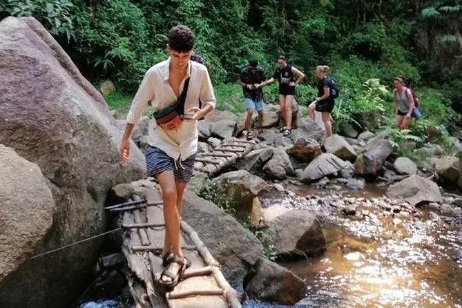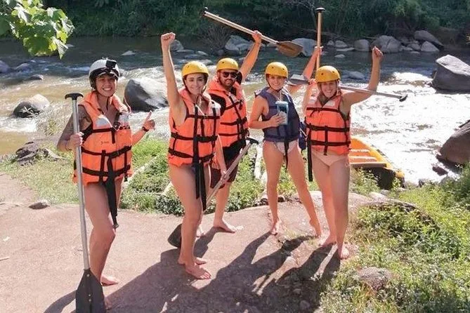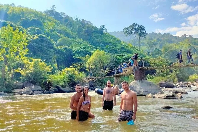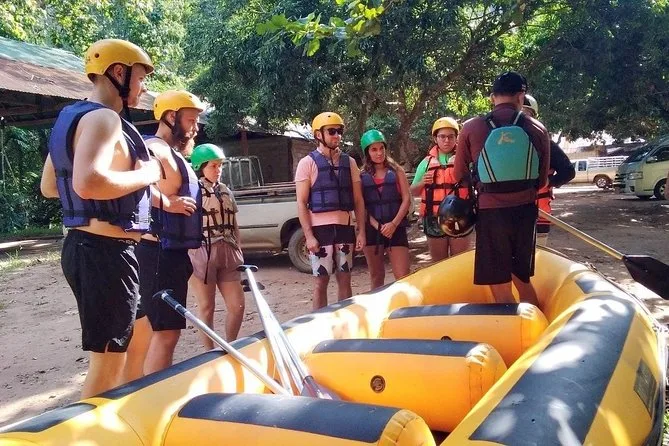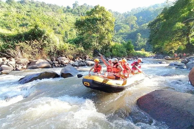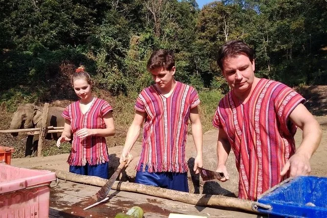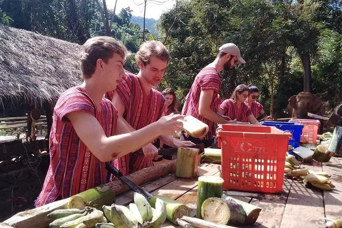 Du bereitest Futter für die Elefanten zu, siehst ihr Schlamm-Spa und Flussbad, genießt Mittagessen, machst etwa 50 Minuten Wildwasser-Rafting und wanderst zwei Stunden durch den Dschungel zu einem Wasserfall.