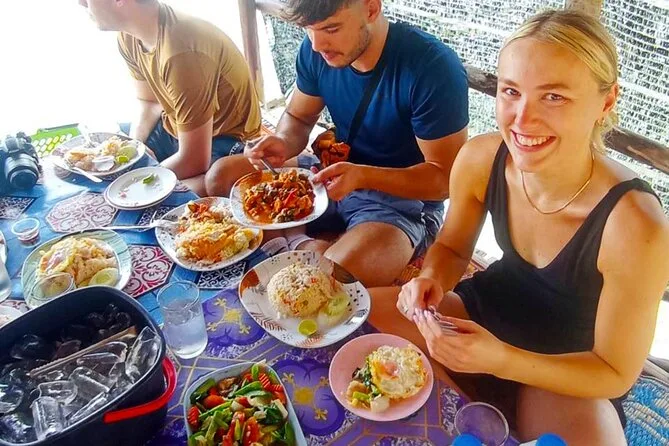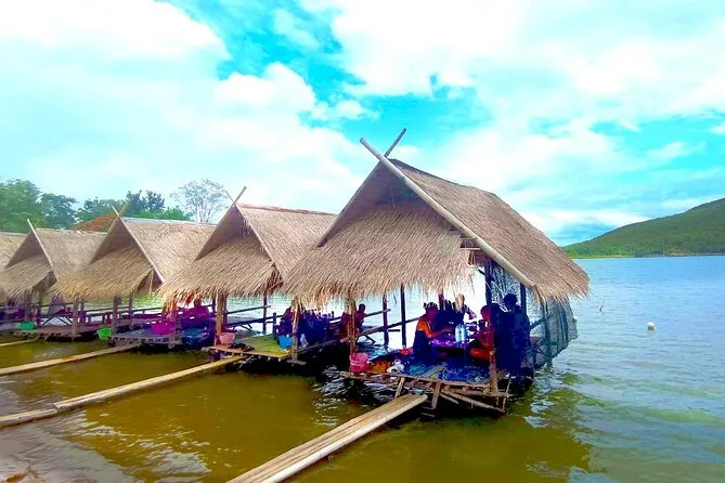 Endlich erreichten wir den Huay Tung Tao See – Beine zittrig, Gesichter verschwitzt – und ließen die Bikes einfach ins Gras fallen. Kaltes Wasser wartete (ein Segen), dazu gab’s diesmal eine größere Mahlzeit: scharfe Suppe, Klebreis, etwas Gebratenes, das ich nie ganz identifizierte, aber trotzdem verschlang. Einige sprangen sofort ins Wasser, ich setzte mich erst mal hin und ließ Körper und Geist ankommen. Das Ganze fühlte sich gleichzeitig schnell und langsam an – du weißt, was ich meine? Ich denke immer noch an den Ausblick vom Abstieg.