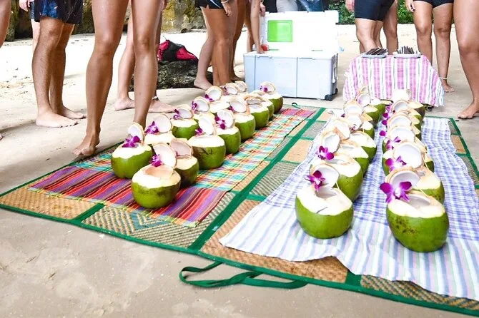 Ich hatte erwartet, mehr Leute zu sehen, aber meistens waren wir allein oder mit ein paar anderen Kajaks ganz ruhig unterwegs. An einer Stelle zeigte Somchai winzige Krebse, die auf den Wurzeln herumhuschten – die hätte ich sonst nie entdeckt. Er erzählte uns Geschichten über die Gezeiten und wie die Einheimischen die Mangroven zum Fischen nutzen (ich hab nur die Hälfte verstanden, aber wünschte, ich könnte besser Thai). Nach einer Fahrt durch eine enge Schlucht, in der kaum Sonnenlicht aufs Wasser fiel, machten wir eine Pause mit Snacks: Klebreiskuchen in Bananenblättern und frischem Kokosnusssaft. Vielleicht lag’s an der Müdigkeit oder daran, dass Essen draußen einfach besser schmeckt – dieses Dessert war auf jeden Fall etwas Besonderes.