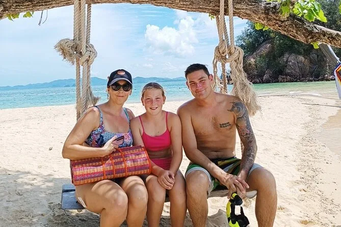 Als nächstes machten wir Halt an Chicken Island (Koh Gai), das wirklich wie ein Hühnerkopf aussieht, wenn man die Felsformation genau betrachtet. Somchai zeigte mir die besten Stellen zum Schnorcheln und half mir sogar, die Maske richtig einzustellen, als ich mit dem Riemen kämpfte. Unter Wasser sah ich kleine blaue und gelbe Fische flink zwischen den Korallen hin und her flitzen. Es ist schon ein besonderes Gefühl, wenn alles so still ist, man mit dem Gesicht im Wasser liegt und nur den eigenen Atem hört. Danach lagen wir noch eine Weile am Strand, und ich versuchte „schön“ auf Thai zu sagen – was zwar nicht ganz klappte, aber Somchai lächelte und meinte, es sei nah dran.