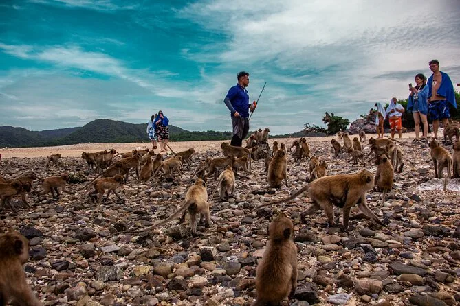 Als nächstes ging’s zu Koh Rin, mit seinen felsigen Ufern und klaren, flachen Buchten. Einige versuchten ihr Glück beim Angeln, andere dösten entspannt in der Sonne. Der letzte Stopp war Monkey Island (Koh Ped), was sich erst wie ein Witz anhörte, bis die Makaken am Strand auftauchten, als gehörte die Insel ihnen. Nok zeigte uns, wie man die Affen füttert, ohne dass sie einem die Snacks klauen – er lachte, als einer ihm eine Banane direkt aus der Hand riss. Auf der Rückfahrt nach Pattaya wurde es ruhiger; alle schauten verträumt aufs vorbeiziehende Ufer, während die Salzluft auf der Haut trocknete.