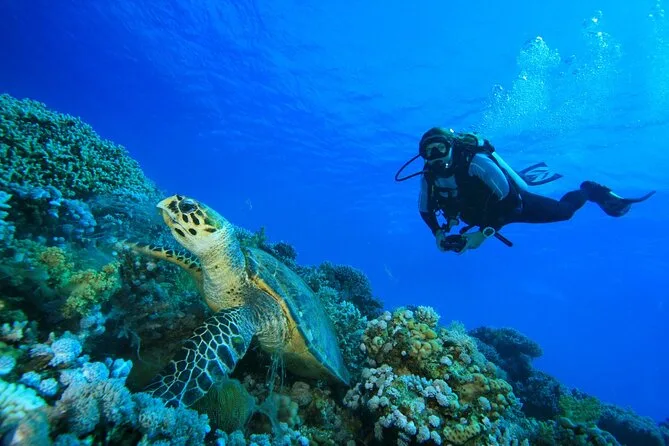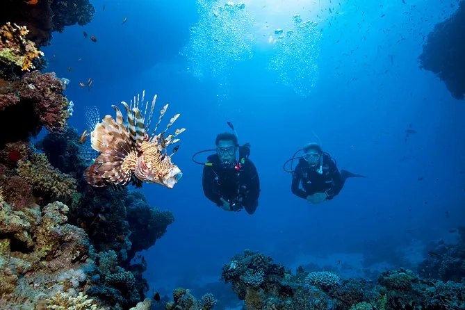Die Tour stellt komplette Tauchausrüstung: Neoprenanzug, Maske, Flossen, Atemregler und Tarierjacket.