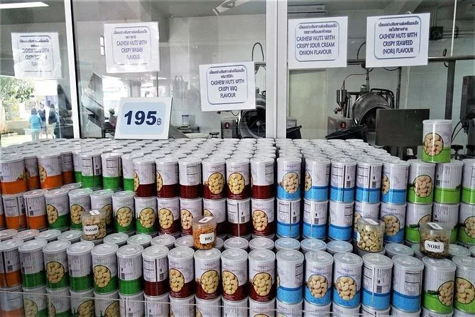 Wir gönnten uns kalte Getränke bei Wangtalang Lapidary, bevor wir zur Cashewfabrik weiterfuhren. Dort durften wir frisch geröstete Cashewkerne probieren – viel besser als die aus dem Supermarkt zuhause. Es blieb auch Zeit zum Einkaufen; viele lokale Snacks und Souvenirs warteten darauf, entdeckt zu werden.
