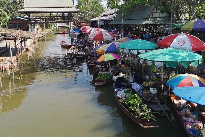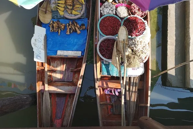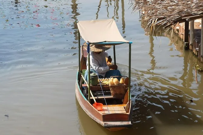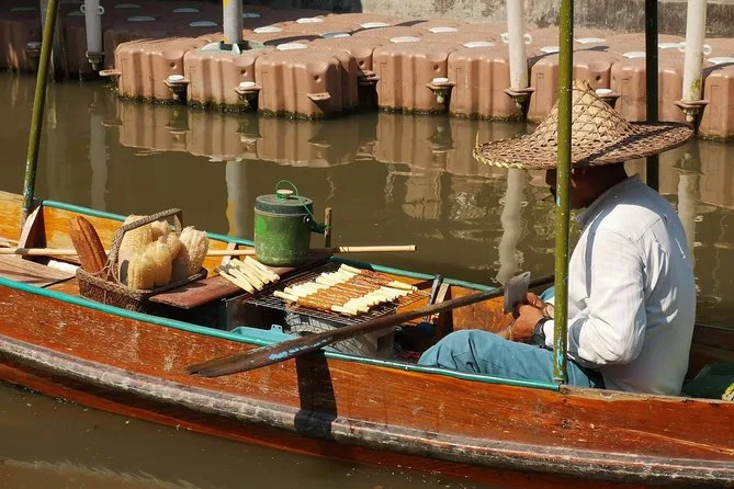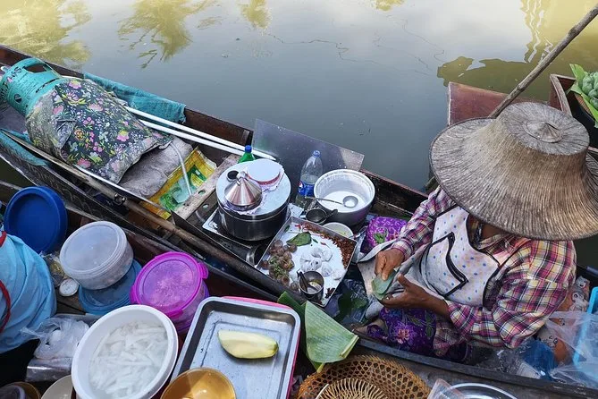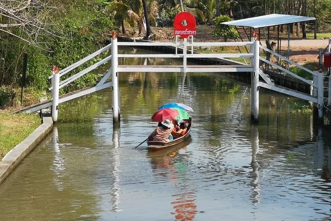 Du gleitest mit einem lokalen Guide im Paddelboot durch den Tha Kha Floating Market, probierst warme Kokos-Spezialitäten von vorbeifahrenden Booten, besuchst den von uralten Banyan-Wurzeln umschlungenen Wat Bang Kung und entspannst beim Mittagessen am Mae Klong Fluss. Ein ruhiger, echter Tag, der lange nachwirkt, wenn du zurück in Bangkok bist.