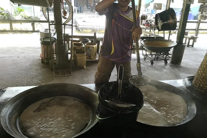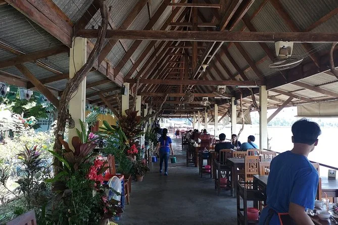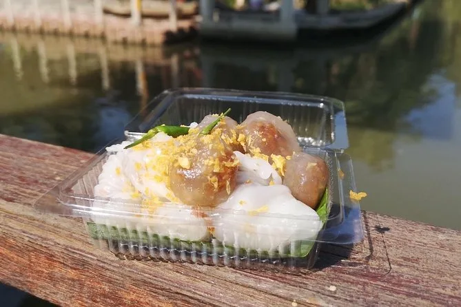 Danach machten wir Halt auf einer nahegelegenen Kokosnussplantage. Der Bauer zeigte uns, wie er Palmzucker herstellt – ich durfte direkt aus dem Topf probieren (klebrig, fast rauchig-süß). Anschließend fuhren wir zum Wat Bang Kung. Der Tempel ist halb von Banyan-Wurzeln umschlungen; man muss unter Ästen hindurchducken, um hineinzukommen. Er ist klein, aber die Stille drinnen ließ mich länger bleiben wollen, als wir es taten. Das Mittagessen gab es an einem offenen Restaurant direkt am Mae Klong Fluss – die Brise vom Wasser tat nach der Sonne richtig gut. Manchmal denke ich noch an diesen Pfannkuchen zurück.