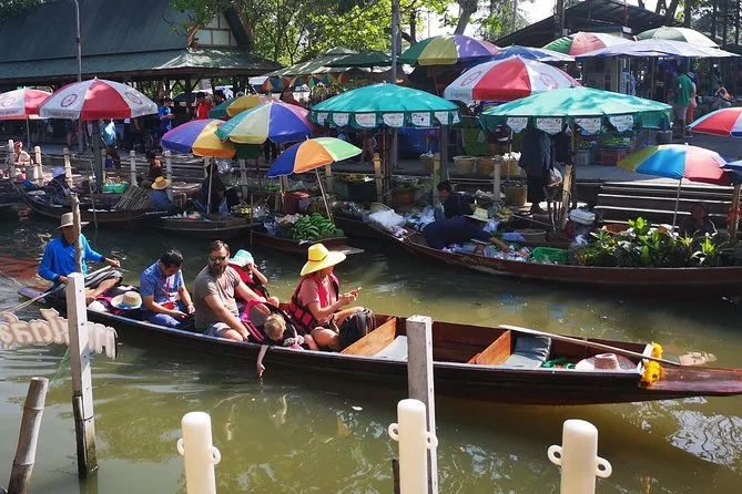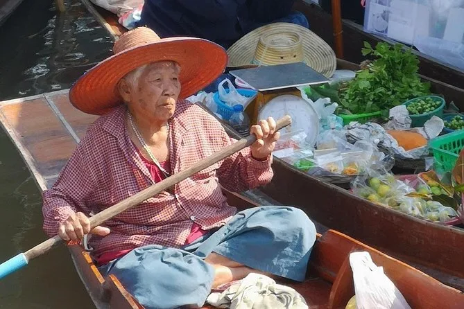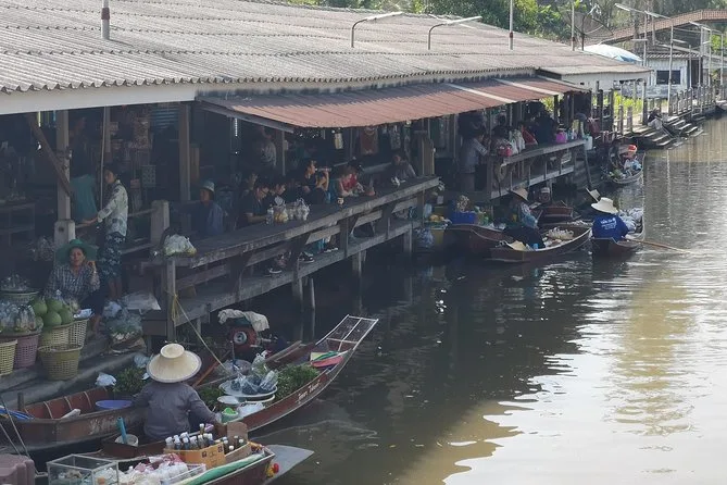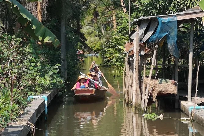 Dein Tag umfasst eine Paddelbootfahrt durch den Tha Kha Floating Market mit einem englischsprachigen Guide, der jeden beim Namen kennt, ein traditionelles thailändisches Mittagessen mit Flussbrise am Mae Klong, sowie Stopps auf einer Kokosplantage und beim von Banyan-Wurzeln umschlungenen Wat Bang Kung, bevor es zurück nach Bangkok geht.