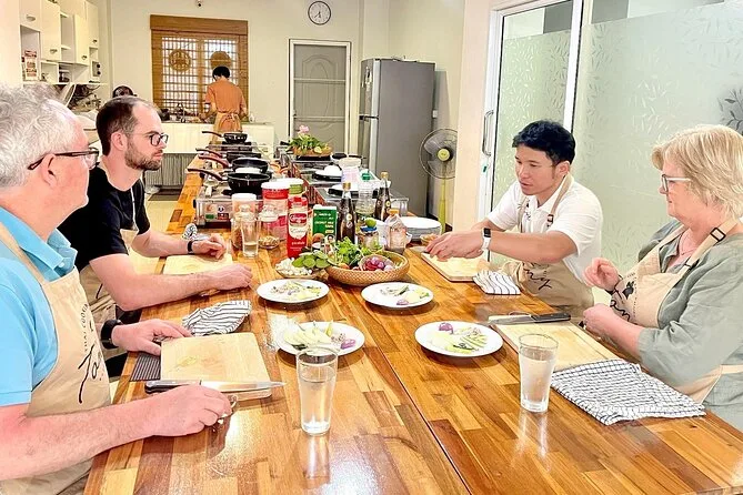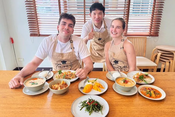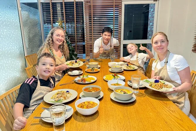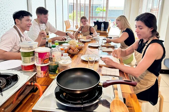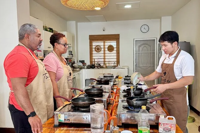 Zurück in der Küche ließen wir uns mit hohen Gläsern Kräuter-Eistee und einem Teller knuspriger Frühlingsrollen nieder. Jeder bekam seine eigene Kochstation (kein Streit um den Pfannenwender hier) plus ein gedrucktes Programm, damit man nicht vergisst, was wohin gehört. Tony führte uns Schritt für Schritt durch den Prozess – wie man Zitronengras für Tom Kha Suppe richtig andrückt, wie man Fischsauce und Palmzucker für Pad Thai perfekt ausbalanciert. Das Beste daran? Jeder darf seine Gerichte aus dem Menü selbst wählen, sodass am Ende wirklich jeder etwas kocht, worauf er Lust hat.