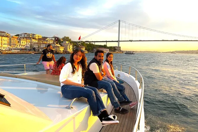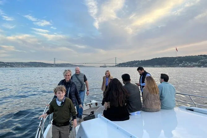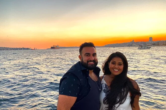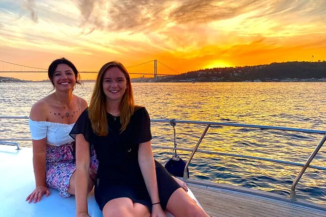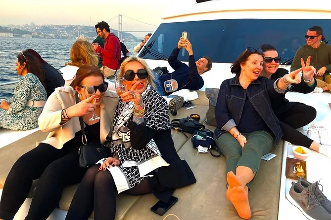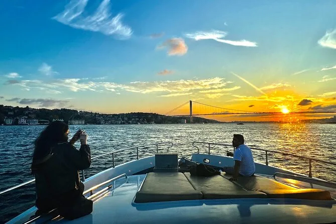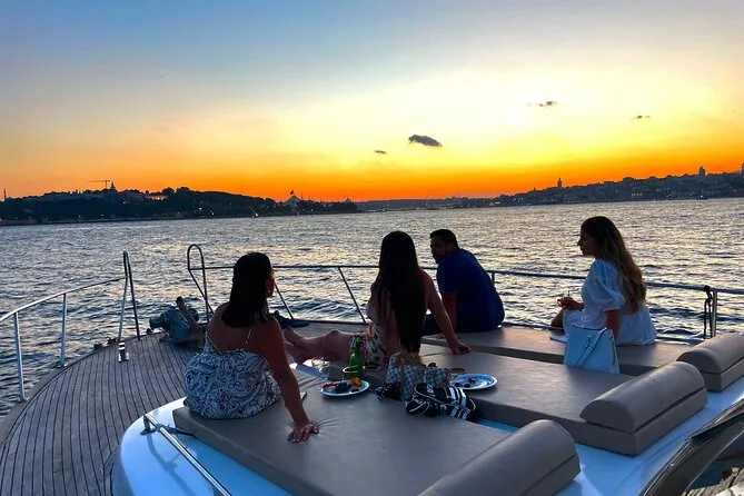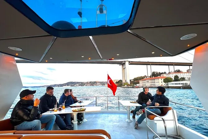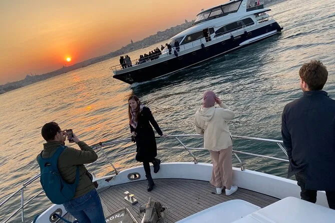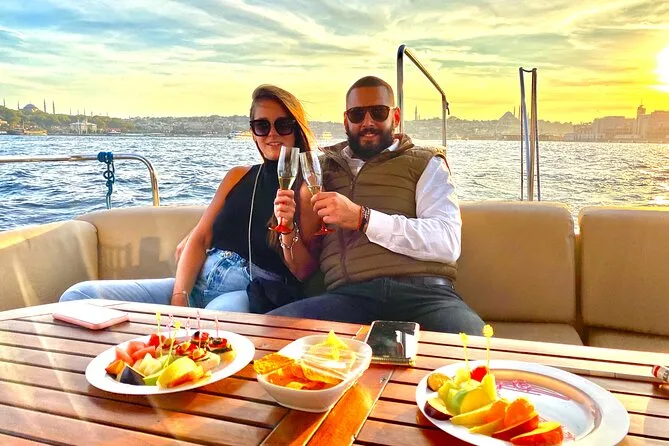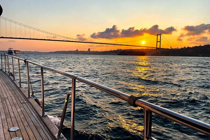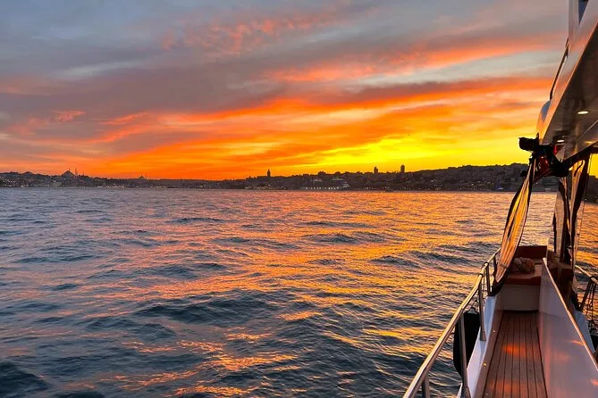 Dein Abend beginnt an Bord einer komfortablen Luxusyacht, die den Bosporus entlangfährt. Ein erfahrener lokaler Guide erzählt dir spannende Geschichten zu den berühmten Sehenswürdigkeiten. Du bekommst täglich frisch zubereitete Obstplatten, leckere Canapés und Baklava-Kekse serviert, dazu türkischen Tee oder Kaffee sowie erfrischende Getränke wie hausgemachte Limonade im Sommer oder frischen Saft im Winter – alles mit Blick auf Paläste und Brücken, bevor die Tour nach Sonnenuntergang zurückkehrt.