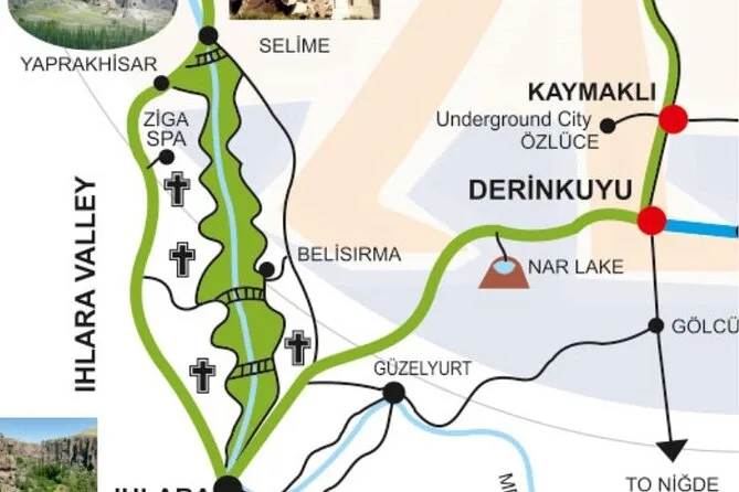Das Ihlara-Tal liegt etwa 80 km von Göreme entfernt; die Fahrt mit dem Minibus dauert rund 1 bis 1,5 Stunden pro Strecke.