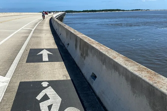 Kaum waren wir auf dem Radweg, lief alles wie von selbst. Das E-Bike hat die meiste Arbeit übernommen, ich musste kaum treten, spürte aber trotzdem dieses Kindheitsgefühl auf dem Rad. Wir glitten unter riesigen Live Oaks mit spanischem Moos hindurch – genau die Art von Bäumen, die einen dazu bringen, langsamer zu fahren und nach oben zu schauen. Beim Überqueren der George Crady Bridge lag eine salzige Brise in der Luft (Jamie zeigte auf Delfine, ich sah nur eine kleine Wasserfontäne). Der Wind wurde stärker, mein Shirt schlackerte so laut, dass es fast wie Applaus klang. Lustig, was einem alles auffällt, wenn man nicht mehr bergauf schnauft.