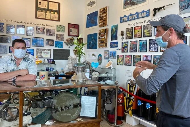 Wir hielten an der Bell Tower Road an, von wo aus sich ein atemberaubender Blick über Avalon bot – so einer, der einen ganz still werden lässt, ohne dass man es will. Dann ging’s runter zum Casino Point Dive Park, wo Manny uns Brot gab, um die Fische zu füttern („Nur nicht reinfallen“, scherzte er). Ich beobachtete die leuchtend orangefarbenen Garibaldi-Fische, während ein paar Taucher sich in der Nähe fertig machten. Der letzte Stopp war ein kleines Tauchmuseum, versteckt hinter allem – allein hätte ich das nie gefunden. Ehrlich gesagt fühlte es sich eher an, als würde man mit jemandem abhängen, der hier aufgewachsen ist, statt auf einer offiziellen Catalina-Tour zu sein.