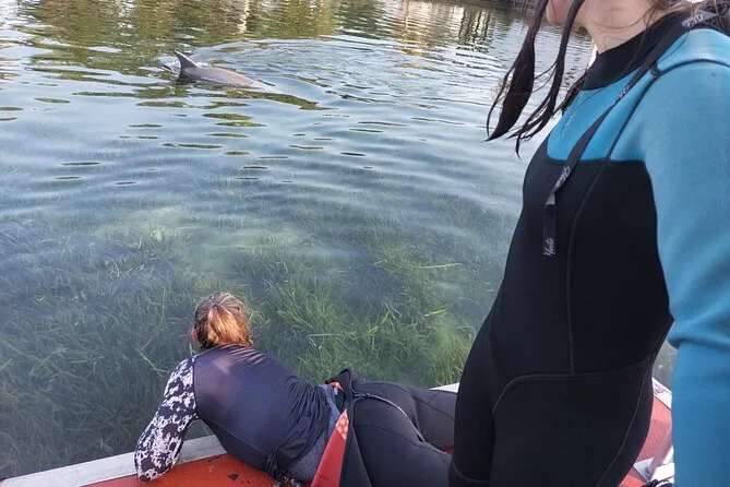 Die Bucht ist riesig – Sarah meinte, sie umfasst rund 600 Acres – und ehrlich gesagt hätte ich mich ohne sie verloren gefühlt. Sie führte uns ruhig weiter, zeigte, wie man entspannt treibt und wartet (statt zu jagen), was viel respektvoller war, als ich es von Wildlife-Touren erwartet hatte. Man hängt einfach da, hört den eigenen Atem und das entfernte Platschen eines Pelikans, der irgendwo landet. Das Wasser ist nicht immer klar – manchmal sieht man nur eine schemenhafte Gestalt an den Flossen vorbeigleiten – aber genau das machte es für mich noch echter.