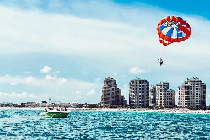 Steig mit Freunden oder Familie in ein Parasailing-Boot in Destin, zieh deine Schwimmweste an und schwebe 120 Meter über smaragdgrünem Wasser, während du Meeresbewohner entdeckst. Genieße zehn Minuten ruhigen Flugspaß, bevor du wieder an Deck landest – ein Mix aus Nervenkitzel und entspannter Auszeit.