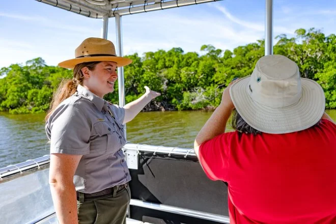 Deine Tour beinhaltet eine geführte Pontonboot-Fahrt durch die Chokoloskee Bay und Everglades City im Gebiet der Ten Thousand Islands, mit spannenden Erklärungen von lokalen Guides oder Parkrangern – plus eine Toilette an Bord für deinen Komfort während der gesamten Fahrt.