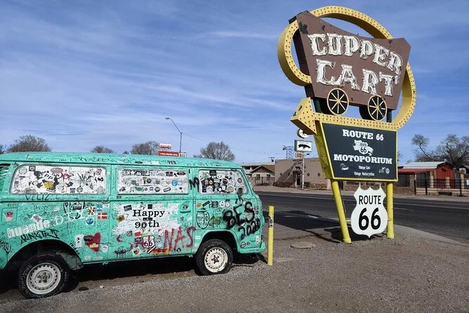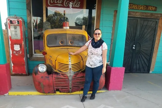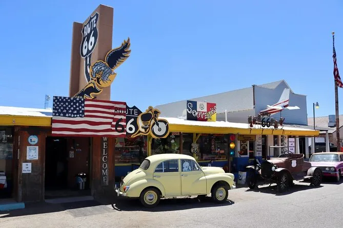 Du hältst an klassischen Route 66-Spots mit Oldtimern, Dinern und nostalgischen Fotomotiven.