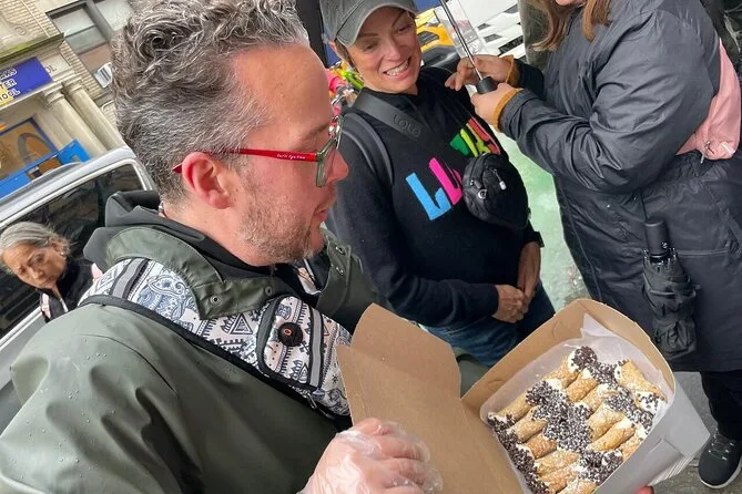 Fast hätte ich es vergessen – wir machten auch Halt am Friends-Haus (ja, genau das). Ben erzählte allerlei Trivia darüber, was echt ist und was nicht. Einige Touristen waren enttäuscht, dass es kein Central Perk drin gibt, aber ich fand es spannend zu sehen, wie normal die Straße wirkte – Nachbarn, die Hunde ausführen oder ihre Pflanzen gießen. Zum Schluss gab’s bei Rocco’s knusprige Cannoli, die mir sogar auf das Shirt bröselten (keine Reue). Auf dem Rückweg zur 6th Ave fiel mir auf, dass ich den ganzen Nachmittag kaum aufs Handy geschaut hatte. Und ich dachte immer noch an diese Reisbällchen.