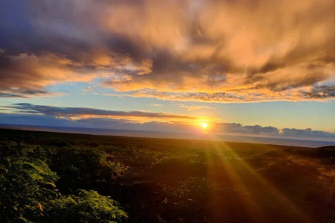 Der Pfad wird holpriger, je tiefer wir in den alten Kiawe-Wald eintauchen. Äste streifen unsere Ärmel, man spürt jeden Stoß in den Armen. Keoni zeigt auf eine wilde Ziege, die flink zwischen den Felsen verschwindet – wenn du blinzelst, hast du sie verpasst. Plötzlich öffnet sich der Wald und vor uns liegt das Meer, tiefblau und wild gegen die schwarzen Lavafelsen brandend. Wir parken die ATVs und laufen ein Stück zum Strand, wo wir Schildkröten im Wasser beobachten. Dass der Sand so grün sein kann, hätte ich nie gedacht – fast unwirklich im Nachmittagslicht.