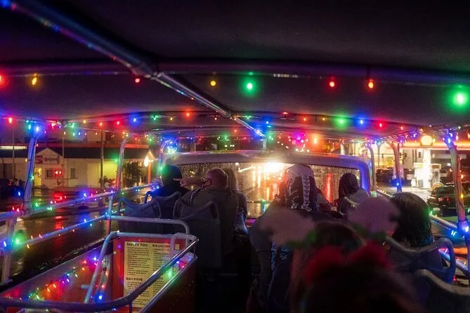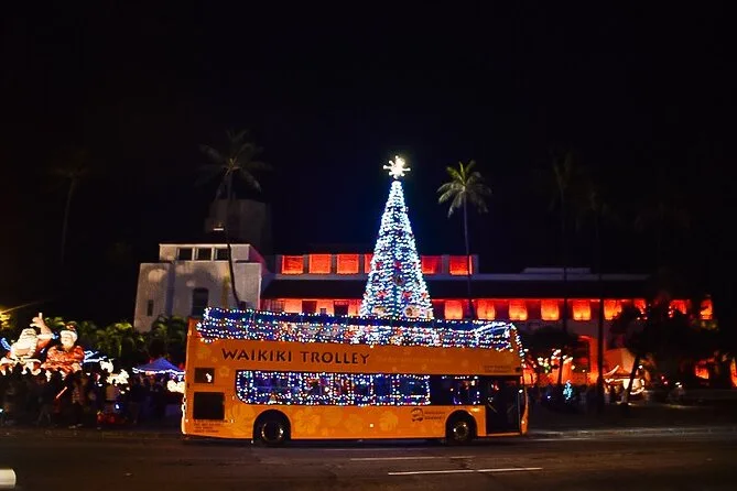 Dein Abend beinhaltet eine offene Trolleyfahrt durch Waikiki und die Innenstadt von Honolulu mit einem lokalen Fahrer-Guide, der unterwegs Geschichten erzählt. Du hältst am Honolulu Hale für die City Lights, bevor es zur Holiday Station am Aloha Tower geht, wo du Spiele spielen, Preise gewinnen und süße heiße Schokolade genießen kannst – danach geht’s zurück mit dem Trolley.