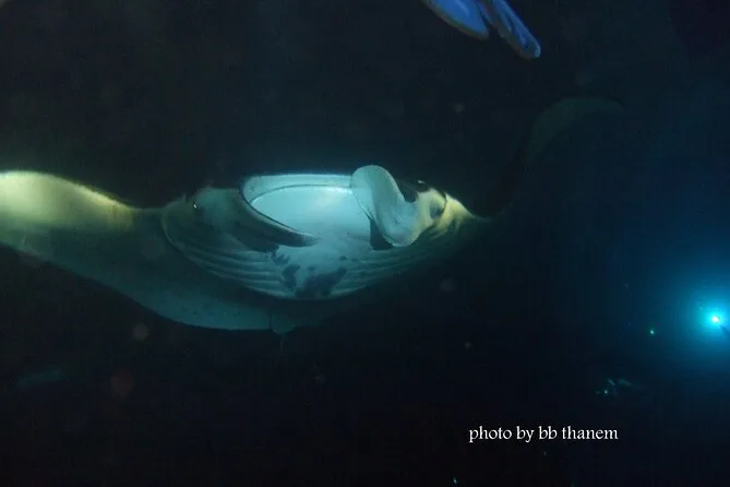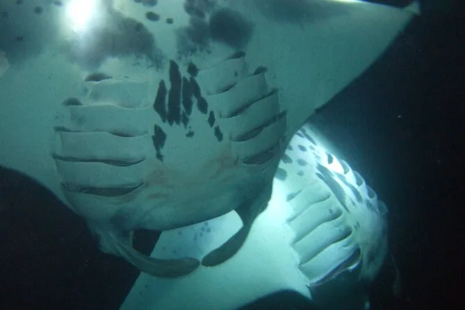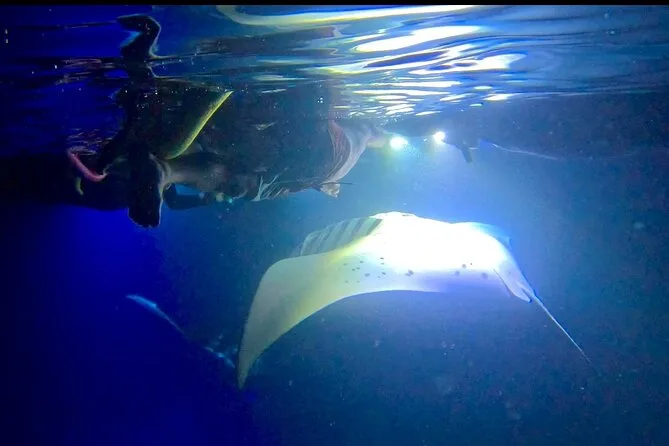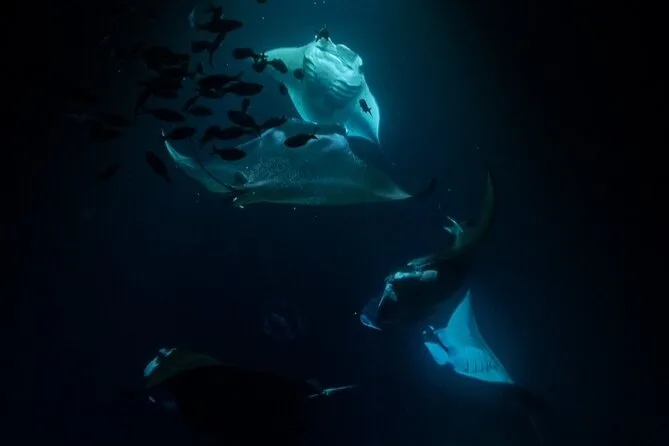 Als wir die Lichter von Kona hinter uns ließen, verteilte unser Guide die Schnorchelausrüstung und auf Wunsch auch Sehstärkenmasken (ich brauchte eine, und ehrlich gesagt, klar sehen zu können, machte den Unterschied). Einer nach dem anderen glitten wir ins Wasser – dieser erste Kälteschock trifft dich selbst durch den Neoprenanzug – und hielten uns an einer schwimmenden Stange fest, die an einem großen Floß befestigt war. Die LED-Lichter unter uns begannen zu leuchten und lockten Plankton an. Es ist ein seltsames Gefühl: Man liegt einfach da, mit dem Gesicht nach unten, hält sich fest, während diese geisterhaften Gestalten darunter zu kreisen beginnen. Als der erste Manta von unten heranflog und seine Flügel fast meine Flossen streiften, glaube ich, ist mein Herz kurz stehen geblieben.