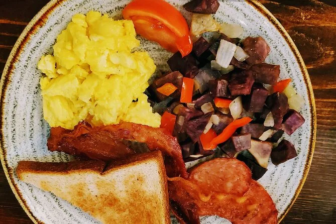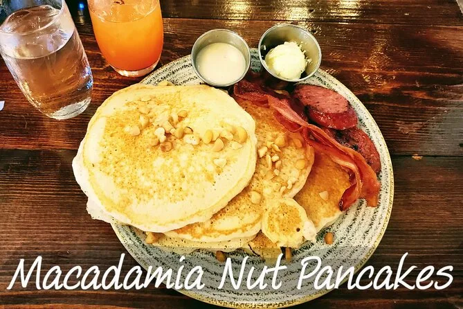 Du kannst zwischen Kokosnuss-Joghurt mit Früchten, dem Plantation-Frühstück (Eier, Speck, Wurst) oder Macadamia-Pfannkuchen mit Speck & Wurst wählen.