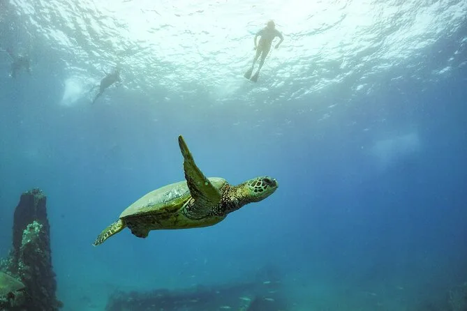 Die erste Delfinschule tauchte auf, noch bevor ich meine Flossen richtig anhatte. Sie waren schnell – schlanke Schatten, die direkt neben uns durchs Wasser glitten – und Kaleo erzählte uns, wie neugierig sie manchmal sind, wenn man ganz still ist. Er hatte nicht übertrieben: Einer tauchte so nah auf, dass ich sein Auge sehen konnte. Das Wasser war kühler als gedacht (vielleicht war ich einfach aufgeregt), aber sobald wir vor Lanai ins Meer gleiteten, wurde alles ruhig. Für einen Moment hörte ich nur meinen eigenen Atem und irgendwo tief unten ein Klicken – vielleicht noch mehr Delfine? Oder einfach meine Fantasie, die mit mir durchging.