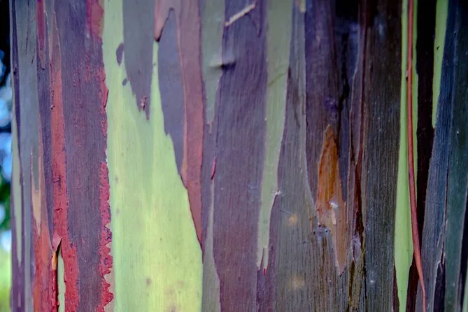 Mit der Kaffeetasse in der Hand beobachtete ich, wie unser Fahrer Kimo – den hier scheinbar jeder kennt – einem vorbeifahrenden Pickup zuwinkte, während wir aus Paia losfuhren. Im Van herrschte Ruhe, nur das Rascheln von Snackverpackungen war zu hören. Jemand reichte mir eine Tüte Taro-Chips, die leicht erdig und süß schmeckten. Von der Road to Hana hatte ich schon viel gelesen, aber wenn man wirklich durch den ersten Tunnel aus Rainbow Eukalyptus fährt, fühlt es sich ganz anders an. Die Farben wirken fast gemalt, doch Kimo versicherte, sie seien echt. Er hielt sogar an, damit wir die Rinde anfassen konnten – kühl, glatt und fast wachsartig.