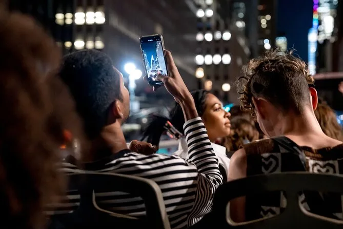 Dein Abendprogramm umfasst eine 1,5-stündige Panoramasightseeing-Tour im offenen Doppeldeckerbus durch New Yorks berühmteste Sehenswürdigkeiten mit voraufgezeichnetem Audioguide in 11 Sprachen und kostenlosen Kopfhörern für beste Klangqualität während der gesamten Fahrt.