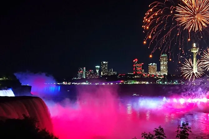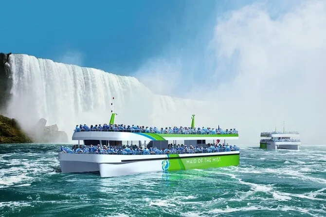 Dein Tag umfasst Hotelabholung und Rückfahrt in Niagara Falls USA, alle Eintrittsgelder inklusive bevorzugtem Einlass bei Cave of the Winds, Tickets für die Maid of the Mist Bootsfahrt, kostenlose Wasserflaschen und Gutscheine für Restaurants oder Attraktionen in der Nähe, bevor du die beleuchteten Niagara Fälle bei Nacht erlebst.