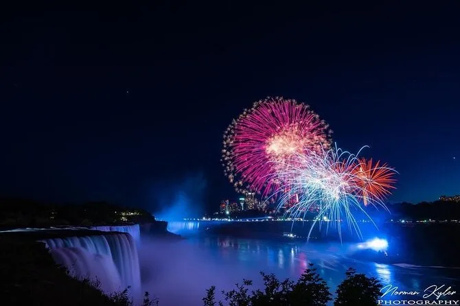 Danach schlenderten wir eine Weile über Goat Island – Marcus zeigte uns, wo drüben der kanadische Teil beginnt (für diese Tour braucht man aber keinen Pass). Am späten Nachmittag standen wir auf dem Observation Tower und blickten auf alle drei Fälle gleichzeitig – ziemlich schwindelerregend von dort oben. Ich schnappte mir einen Kaffee von einem Food Truck (nicht der beste, aber egal) und beobachtete, wie sich die Leute für das Feuerwerk später anstellten. Als die Dämmerung kam, suchten wir uns einen Platz bei Terrapin Point für die Lichtshow. Die Farben waren viel intensiver als gedacht – Rot und Blau flackerten im Nebel – und alle wurden für ein paar Minuten still, um zuzuschauen. Manchmal denke ich noch daran, wenn es zuhause mal wieder laut wird.
